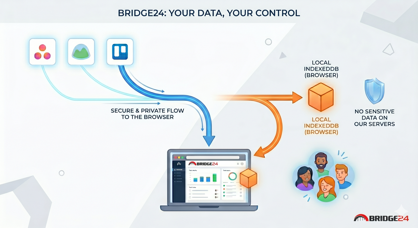 At Bridge24, we know that trust is the cornerstone of project management. When you connect tools like Asana, Basecamp, or Trello to our platform, you are entrusting us with access to your most strategic information: your tasks, your projects, and your teams.